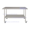 Mặt bàn chính được làm bằng inox phẳng, sáng bóng, bền chắc. Phía dưới là tầng song inox chắc chắn, vừa giảm trọng lượng tổng thể của bàn, vừa giúp việc di chuyển dễ dàng hơn. Tầng song này cũng thích hợp để chứa các vật dụng lớn, tạo sự thoáng khí và gọn gàng.
