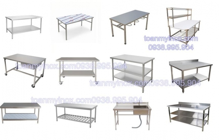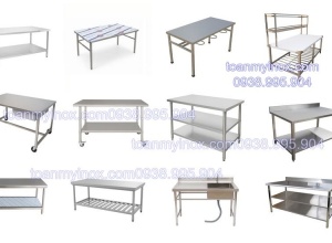 Thiết kế: Dáng bàn gọn gàng, khung inox chắc chắn, chịu lực tốt. Một số mẫu còn tích hợp kệ hoặc ngăn kéo để tăng tiện ích.