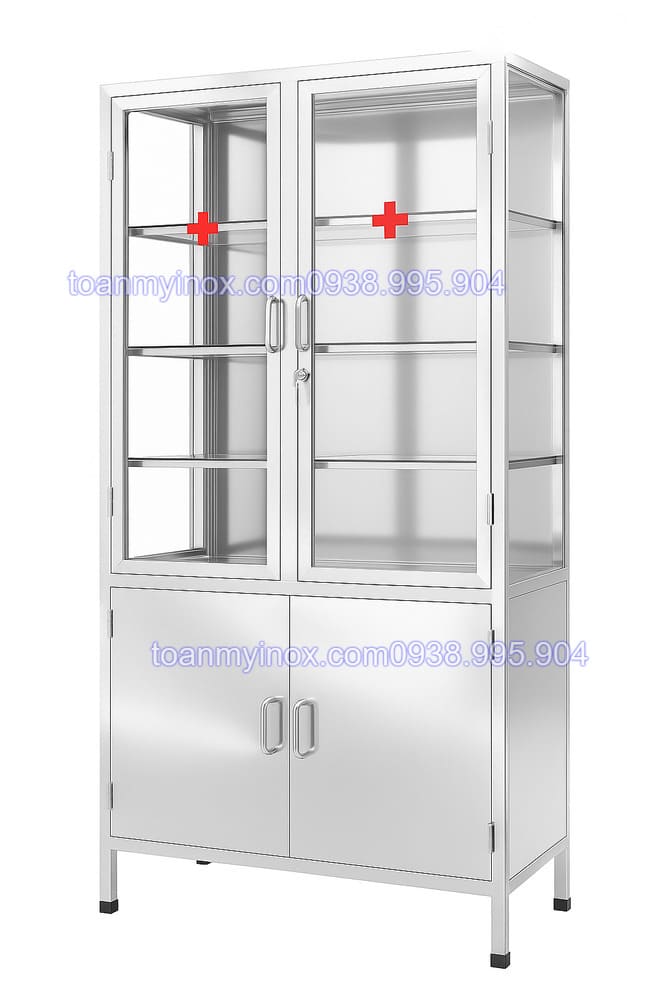 Tủ thuốc y tế inox được sản xuất từ inox dành riêng cho môi trường y tế, có khả năng kháng khuẩn, chịu lực tốt và dễ dàng vệ sinh, phù hợp với môi trường y tế yêu cầu cao về độ sạch và an toàn. Thiết kế tủ gồm nhiều ngăn và kệ tiện lợi, giúp sắp xếp thuốc, bông băng, dụng cụ sơ cứu gọn gàng, dễ tìm kiếm khi cần. Cửa tủ có thể làm bằng inox, kính hoặc mica trong suốt, tạo sự hiện đại và dễ quan sát bên trong.